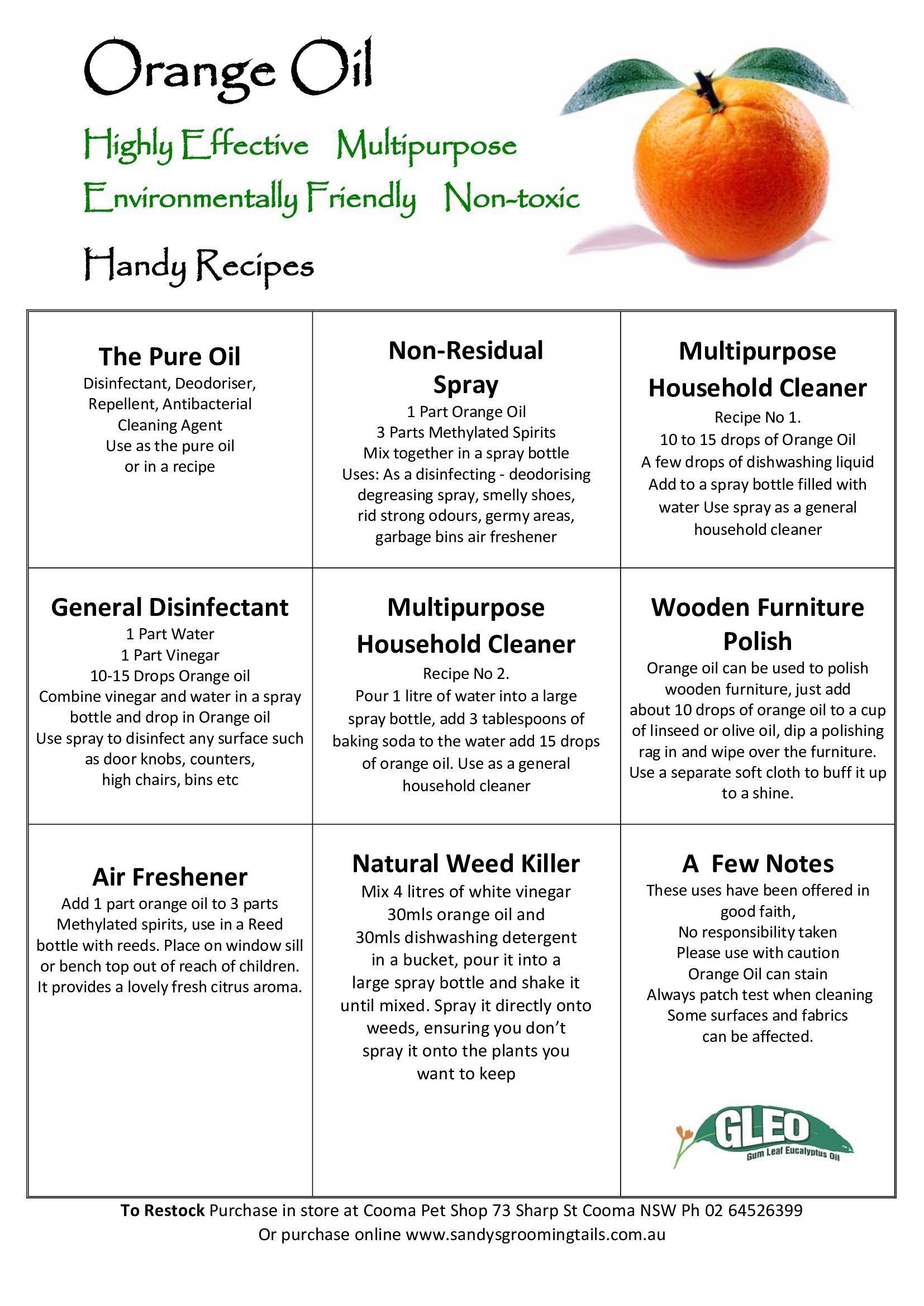 These uses have been offered in good faith No responsibility taken PLEASE USE WITH CAUTION Always patch test Orange Oil when cleaning Some surfaces and fabrics can be affected Orange Oil can leave an orange stain.